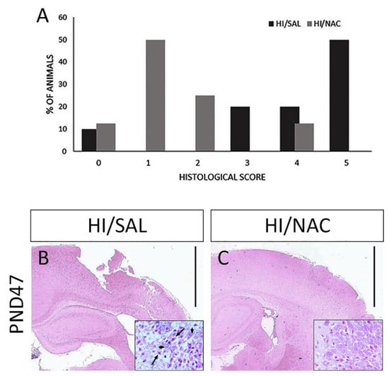 Histological analysis was conducted for PND 10 (SHAM n = 5, HI/SAL n = 8, HI/NAC n = 8) and following the completion of sensorimotor testing (PND47, SHAM n = 10, HI/SAL n = 16, HI/NAC n = 13). Following the completion of sensorimotor testing (PND47), the animals were transcardially perfused under deep anesthesia with normal saline followed by 4% phosphate buffered paraformaldehyde solution. Subsequently, their brains were removed and embedded in paraffin. Serial sections at the level of the dorsal hippocampus (−3.24 mm to −3.36 mm posterior to bregma) were obtained and stained with hematoxylin-eosin. The degree of brain damage in the ipsilateral to the ligated carotid artery cerebral cortex and hippocampus was scored on a 6-point scale as follows:0 = normal, 1 = few neurons damaged (1–5%), 2 = several neurons damaged (6–25%), 3 = moderate number of neurons damaged (26–50%), 4 = greater than half of neurons damaged (51–75%), 5 = majority or all of neurons damaged, including infarction (>75%) [,].