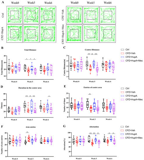 Anxiety-like behavior has been observed in CPZ mice [37,38]. Open field test (OFT) was assessed to appraise their motor activity and anxiety-like behavior in a novel environment. The total distance reflects the movement activity of the mice, and the center distance, duration of the movement in the center area, and entries of the center area reflect the anxiety of mice. The habituation pattern was measured for 5 min in the square (Figure 2A). Compared to CPZ mice, HupA-treated mice showed significant effects on the total distance (Figure 2B). Moreover, CPZ mice spent less time on the centre area, such as centre distance, duration of the movement in the centre area, and entries of the centre area (Figure 2C–E), thereby suggesting that CPZ mice displayed anxiety-like behaviors. However, HupA treatment effectively relieved these symptoms after 1 week of treatment (Figure 2C–E).