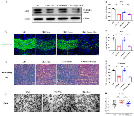 HupA promoted the formation of the new myelin sheath in CPZ-induced demyelination. (A–F) Histological evaluation of the demyelination was performed by western blot, MBP, and LFB staining and quantified by Image-J software, scale bar = 50 μm. Representative images of western blot, LFB, and MBP staining were observed in the corpus callosum of the brain. (G) TEM ultrastructure of the corpus callosum (Scale bar = 5 μm). (H) Each group of g-ratio in the corpus callosum. The results represent the mean ± SEM (** p < 0.01, *** p < 0.001, n = 3/4 mice per group).