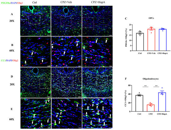 HupA did not display any effect on the amount of PDGFRα+ Olig2+ OPCs but increased the amount of CC1+ Olig2+ mature oligodendrocytes in the corpus callosum. (A) Double IHC with anti-PDGFRα and anti-Olig2 in the corpus callosum. PDGFRα (green), Olig2 (red), DAPI (blue), scale bar = 50 μm. (B) Partially enlarged view of figure A. White arrows represents OPCs, scale bar = 50 μm. (C) The percentage of PDGFRα+/Olig2+ OPCs in the corpus callosum of each group. (D) Double IHC with anti-CC1 and anti-Olig2 in the corpus callosum. CC1 (green), Olig2 (red), DAPI (blue), scale bar = 50 μm. (E) Partially enlarged view of figure D. White arrows represent the mature oligodendrocytes, scale bar = 50 μm. (F) The percentage of CC1+/Olig2+ mature oligodendrocytes in the corpus callosum of each group. The results represent the mean ± SEM (*** p < 0.001, n = 4 mice per group).