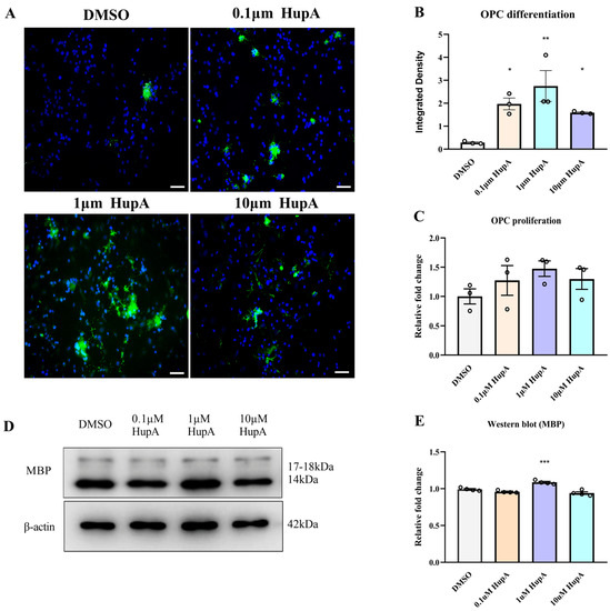 We also determined the effect of HupA by culturing OPCs in vitro. Three different concentrations (0.1/1/10 μM) of HupA did not markedly affect the quantity of PDGFRα+ OPCs in the corpus callosum by Cell Titer-Glo (CTG) (Figure 5C), which was consistent with Figure 4A–C. Due to the high sensitivity and long signal duration, CTG has become the mainstream cell viability detection method, which can quickly and sensitively detect the number of viable cells [43]. However, immunocytofluorescence (ICC) assays also suggested that HupA (0.1/1/10 μM) promoted the differentiation of OPCs in vitro settings (Figure 5A,B). Western blot results displayed that HupA induced OPC to differentiate into mature oligodendrocytes, especially when the concentration was 1 μM, which was the same as the results in 5A, B (Figure 5D,E).