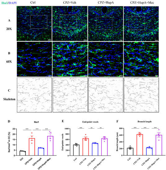 HupA treatment reduced the quantity of microglia in the corpus callosum. (A,B) Iba1 IHC. (C) Morphological analysis of the structure of microglia. (D–F) Quantitative analysis of the proportion of microglia in the corpus callosum, the number of branch ends, and total branch length. The results represent the mean ± SEM (** p < 0.01, *** p < 0.001, n = 4 mice per group).