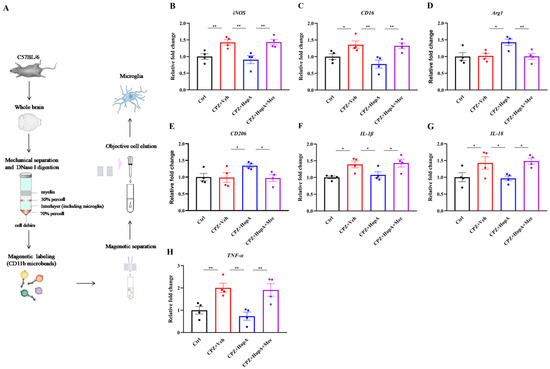 HupA modulated the expression of pro-inflammatory and anti-inflammatory molecules in the microglia. (A) Administration of microglia extraction by magnetic beads. (B–E) The result of qRT-PCR was to assess the mRNA expression of pro-inflammatory genes (iNOS and CD16) and anti-inflammatory genes (Arg1 and CD206) in the microglia. (F–H) The result of qRT-PCR analysis to detect the expression of pro-inflammatory cytokines (IL-1β, IL-18, and TNF-α) in the microglia. The results represent the mean ± SEM (* p < 0.05, ** p < 0.01, n = 4 mice per group).