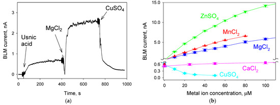 (a) Effect of magnesium ions (20 µM) on the induction of electrical current through BLM by usnic acid (UA, 20 µM) and the inhibitory effect of copper ions (20 µM); (b) dependence of the UA-mediated electrical current through BLM on the concentration of calcium, magnesium, manganese, copper and zinc ions. The solution was 10 mM Tris, 10 mM MES, 10 mM β-alanine and 10 mM KCl with a pH of 6.0. BLM voltage was 30 mV. BLM was created from DPhPC. The data in panel (b) are represented as the mean ± SE, with n = 3.
