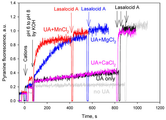 To confirm the divalent cation preference of UA by an alternative experimental technique, we monitored the pH gradient resulting from the cation–proton exchange activity of UA in the pyranine-loaded liposomes. The addition of 1 mM MnCl2 (red curve in Figure 2), 1 mM MgCl2 (blue curve) or 1 mM CaCl2 (pink curve) to the buffer solution (pH 6.0) outside the liposomes containing 30 µM UA caused alkalization inside the liposomes, manifesting in an increase in the pyranine fluorescence intensity as a result of the influx of the divalent cations and the efflux of the protons from the liposomes (Figure 2). The subsequent addition of KOH at 75 s, shifting the external pH from 6 to 8, led to a substantial stimulation of the alkalization inside the liposomes. The alkalization was the most pronounced in the case of MnCl2 (red track), intermediate in the case of MgCl2 (blue track) and small in the case of CaCl2 (pink track). The black track displayed a weak alkalization of the liposomal lumen induced by UA without the addition of divalent cations. No alkalization took place inside the liposomes in the absence of UA, thereby showing that there was no proton leakage from the liposomes without UA (grey track). In the control experiments without UA, even 1 mM Mn2+ did not elicit a proton leakage (Chart S3 in the Supplementary Materials). We have not presented the data of similar experiments with ZnCl2 and CuCl2 because these cations caused a strong quenching of the pyranine fluorescence (Chart S4 in the Supplementary Materials). Therefore, the liposome system showed the following series of UA cation selectivity: Mn2+ > Mg2+ > Ca2+.