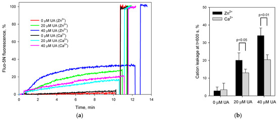 The preparation of liposomes loaded with 100 mM CaCl2 or ZnSO4 and the measurements of the Ca2+ (Zn2+) efflux from the liposomes were performed as described in [18]. The outside Ca2+ and Zn2+ were assayed by measuring the fluorescence intensity of the Ca2+ (Zn2+)-sensitive fluorophore Fluo-5N at 520 nm upon excitation at 495 nm with a Solar CM2203 spectrofluorometer (Minsk, Belarus). To remove the contribution of 3–5 µM Ca2+, always present in the medium outside the liposomes, to the Fluo-5N fluorescence, we added an aliquot of 1 mM EDTA before the addition of UA.