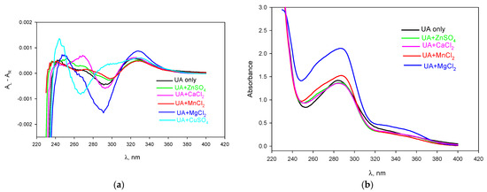 CD (a) and absorbance (b) spectra of UA (50 µM) in the absence (black curve) and in the presence of 1 mM calcium (pink), magnesium (blue), zinc (green), manganese (red) and copper (cyan) ions in methanol. The concentration of CuSO4 was 0.1 mM.