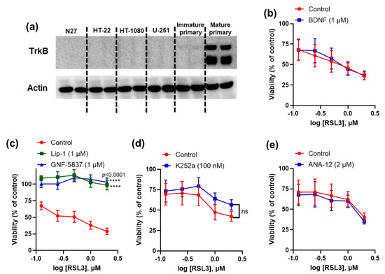 We first screened different immortalised cell lines, such as N27, HT-22, HT-1080, and U-251, as well as primary cortical neurons for their TrkB expression and found that only mature primary cortical neurons express detectable levels of TrkB receptors (Figure 1a). Mature primary neurons are resistant to erastin toxicity, so we tested the following TrkB modulators against sensitivity to RSL3 in these cells: agonist BDNF, antagonist ANA-12, and tyrosine kinase inhibitors K252a and GNF-5837. The TrkB inhibitor, GNF-5837, abolished ferroptosis in mature primary cortical neurons, but other modulators had no effect (Figure 1b–e).