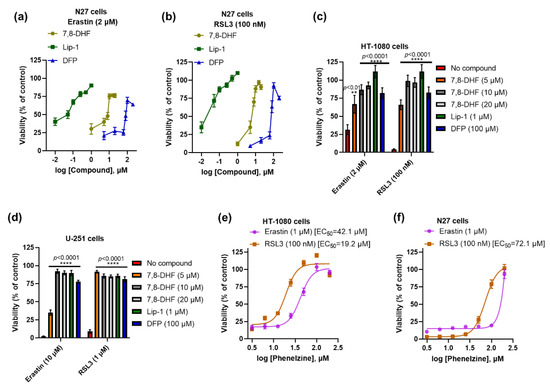 Both 7,8-DHF and phenelzine protect ferroptosis in several immortalised cell lines. Efficacy of 7,8-DHF, Lip-1, and DFP against erastin- and RSL3-induced ferroptosis in N27 cells (a,b). Like Lip-1 and DFP, 7,8-DHF significantly prevents ferroptosis in HT-1080 and U-251 cells (c,d). Efficacy of phenelzine against erastin- and RSL3-induced ferroptosis in HT-1080 and N27 cells (e,f). Cells were co-treated with ferroptosis inducers and tested compounds for 24 h. Cell viability was measured by MTT assay. Data points signify mean percentage survival relative to untreated controls ± SEM, n = 12–20 from 3–5 independent experiments. p values were calculated using the two-way ANOVA (Šídák’s multiple comparisons test), and the significant levels are noted as ** p < 0.01 and **** p < 0.0001 (vs. no compound).