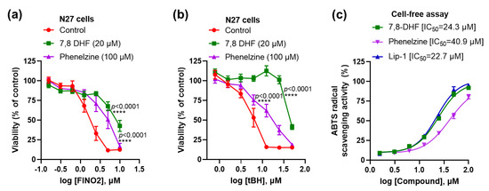 Both 7,8-DHF and phenelzine protect against ferroptosis and have RTA properties. Both 7,8-DHF and phenelzine attenuate FINO2- and tBH-induced toxicity (a,b). RTA properties of 7,8-DHF, phenelzine and Lip-1 in cell-free ABTS assay (c). Cells were co-treated with ferroptosis inducers and tested compounds for 24 h, except for tBH, which had a 4 h co-treatment. Cell viability assay was measured by MTT assay. Data points signify mean percentage survival relative to untreated controls ± SEM, n = 9–16 from 3–4 independent experiments. P values were calculated using the two-way ANOVA (Dunnett’s multiple comparisons test), and the significant level is noted as **** p < 0.0001 (vs. control).
