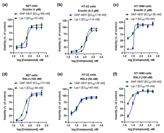 GNF-5837 protects ferroptosis in several immortalised cell lines. Comparative anti-ferroptotic activity between GNF-5837 and Lip-1 for erastin- and RSL3-induced ferroptosis following 24 h incubation in different cell lines: N27, HT-22, and HT-1080 cells (a–f). Cell viability was measured by MTT assay. Data points signify mean percentage survival relative to untreated controls ± SEM, n = 11–16 from 3–4 independent experiments.