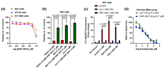 GNF-5837 protects against ferroptosis likely via its RTA property. Toxicity assay upon 48 h treatment with GNF-5837 in different cell lines (a). GNF-5837 protects against toxicity induced by FINO2, tBH, and iron in N27 cells (b). Like Lip-1, GNF-5837 significantly protects against lipid peroxidation in the C11 BODIPY assay caused by erastin, BSO, and RSL3 in N27 cells (c). RTA property of GNF-5837 and Lip-1 against lipid peroxidation in cell-free MDA assay (d). Cells were co-treated with ferroptosis inducers and tested compounds for 24 h, except for tBH-induced ferroptosis, which had a 4 h co-treatment, and MTT assay measured cell viability. Lipid peroxidation in C11 BODIPY assay is expressed as the ratio of green to red C11 BODIPY fluorescence. Data points signify mean percentage survival relative to respective controls ± SEM (n = 36 for (a), n = 9–12 for (b,c), and n = 6 for (d) from 3–4 independent experiments). P values were calculated using the one-way ANOVA (Tukey’s multiple comparisons test for (b)) and two-way ANOVA (Dunnett’s multiple comparisons test for (c)), and the significant level is noted as **** p < 0.0001 (vs. inducers/control).