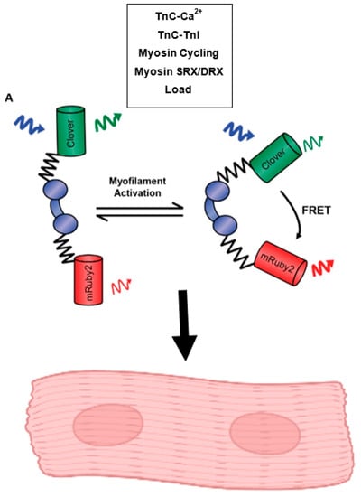 The examination of sarcomeric activation at the level of the thin filament in real time in intact muscle has been a long-sought goal of the field. To this end, recent work has resulted in the development of a cardiac-specific FRET-based biosensor engineered into cardiac TnC and expressed in myofilaments in a transgenic mouse line [123]. This mouse model allows for the reporting of the effects of many known thin filament ligands, including calcium, TnI, Tm, and myosin cycling, in the time scale of a single twitch under physiological conditions in intact muscle (Figure 3). Results from this system have provided evidence relating to the conformational changes TnC undergoes upon calcium binding, and how this relates to the ability of TnC to act as a nexus point for sarcomeric signaling, many pathways of which have been previously highlighted in this review. Specifically, using small molecules or genetic models to perturb the ability of TnC to interact with known ligands, such as TnI, demonstrated the ability of the biosensor to detect the activating effects of the TnI switch domain binding to TnC, a thin filament-driven pathway of contraction regulation. It was shown that the biosensor is able to sense the state changes of the TnI switch region and it is widely accepted that the switching mechanism of TnI directly affects the positioning of Tm on the thin filament. Therefore, this can be used as a proxy for the localization of Tm during the time course of a twitch contraction as well. The use of small molecules also illustrated the ability of the biosensor to sense changes in myosin cross-bridge rates, a thick filament-driven pathway of contraction regulation. Importantly, the biosensor reported changes in myosin states in a load-dependent manner, providing support for the ability of myosin cross-bridge formation to influence thin filament activation in the physiological environment of an intact, loaded cardiac muscle [123]. This is in line with myosin having a critical role in maintaining sarcomere activation versus initiating activation. With the design of this biosensor, there is now the opportunity to expand understanding of the many mechanisms which regulate and tune heart performance, especially in the context of sarcomere dysfunction in cardiac disease with the potential to leverage this system in order to identify potential new therapeutics.