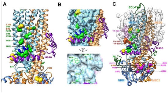 The groove of MSD1, in the vicinity of which are located several class II mutations (Figure 1A,B), is occupied by the correctors Lumacaftor (VX-809) – Tezacaftor (VX-661) (Figure 1C) [22,23]. It can thus be considered as a fragile region of the protein, concentrating mutations and stabilized by the action of pharmaco-chaperones. It is lined by TM1, TM2, TM3, TM6 and the elbow helix (in dark blue on Figure 1), which runs parallel to the TM helices and is located at the interface between the phospholipid bilayer and the cytosol. This elbow helix is in tight contact with a cytosolic alpha-helix (Lh2) belonging to an ABCC-specific motif called “lasso” (in purple on Figure 1). In particular, a salt-bridge is observed in CFTR between the Lh2 E56 and the elbow R75 [22]. Similar grooves are observed for members of the ABCC subfamilies, for which 3D structures have also been solved, such as human MRP1 (ABCC1) [30] and human SUR1 (ABCC8) [31] (Figure 6).