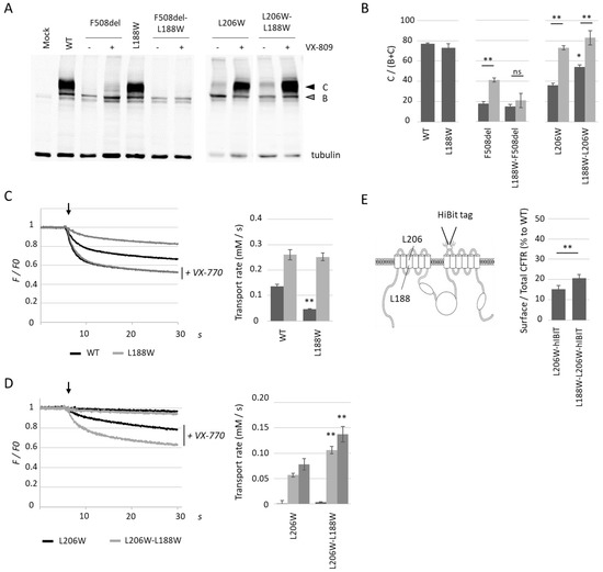 L188W partially reverts the folding defects of L206W but not F508del. (A) Western blot analysis of proteins obtained from HEK293 cells transiently transfected with the indicated CFTR mutant with and without VX-809 (3 µM, 24 h). Arrows indicate mature fully glycosylated CFTR (dark, band C) and partially glycosylated CFTR (grey, band B). Tubulin was used to assess equal loading. (B) Quantification of the C/(B + C) maturation ratio from the western blot analysis of the indicated mutants. Dark grey represents control conditions and light grey VX-809 treatments. Measures are means ± SEM of n = 5–10, with * indicating p < 0.05, ** indicating p < 0.01. (C,D) Representative recordings using the halide sensitive YFP assay obtained from HEK293 cells expressing indicated CFTR mutant before and after addition of iodide-containing PBS (injection indicated with an arrow), with and without the CFTR potentiator VX-770 (10 µM). Histograms represent mean ± SEM of calculated transport rates for the indicated mutant. In (C), dark grey represents cAMP cocktail induced activation (n = 5) and light grey cAMP + VX-770 (n = 5) and in (D) dark grey represents cAMP cocktail induced activation (n = 7), light grey cAMP + VX-770 (n = 6) and medium grey cAMP + VX-770 + apigenin (n = 3) with for both, * indicating p < 0.05, ** indicating p < 0.01 and ns non-significant. (E) Cell surface expression of L206W and L206W-L188W normalized to the total CFTR in the cell and compared to CFTR-WT (n = 5) with ** indicating p < 0.01. Measures were performed using the hIBIT complementation assay with the hIBIT tag inserted between amino acids Ser898 and R899.