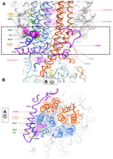 The L206W and L206W-L188W mutations on the 3D structure of human CFTR. (A,B) A 3D structure of CFTR-WT in complex with VX-661 (pdb:7SV7), taken as a reference and embedded in a model lipid bilayer (POPC, grey surface). The two views are orthogonal. The slice shown in panel (B), viewed from the NBDs, is highlighted with a dashed bow in panel (A). Depicted in atomic detail, amino acids of the VX-661 binding pocket (green), affected by class II mutations (yellow), basic amino acids of the cytoplasmic portal and vestibule [28,29] (blue), and amino acids involved in salt-bridges [22,26] (pink).