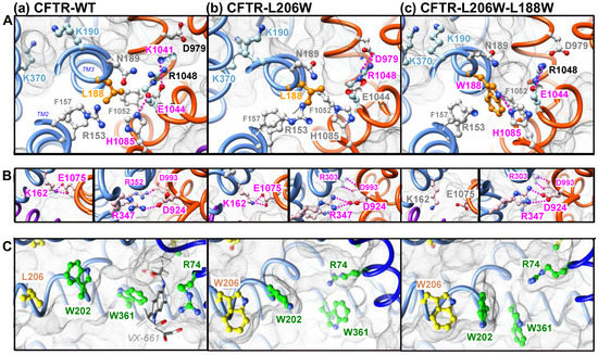 (A–C) Comparison of the 3D structures of CFTR-WT (a), CFTR-L206W (b), or CFTR-L206W-L188W (c), with focuses on the L188 neighborhood (A), the salt-bridges (B), and the relationship between L206W and the binding groove (C). The 3D structures of the mutated proteins are illustrated here after 700 ns MD simulations (starting from the 3D structure of human CFTR (pdb:6MSM)). Amino acids linked by H-bonds or salt bridges are depicted in pink.
