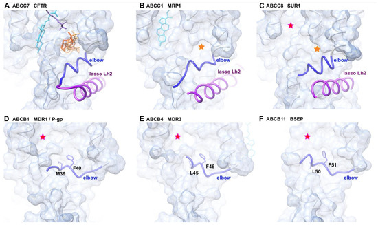 Comparison of the MSD1 from type IV exporters of the ABCC and ABCB families. Surface representation, after superimposition, of the experimental 3D structures of three members of the ABCC subfamily: ((A) human CFTR, pdb 7S7V; (B) bovine MRP1, pdb 6VY0; (C) human SUR1, pdb 7S5X) and three members of the ABCB subfamily; ((D) human ABCB4, pdb 6S7P; (E) human ABCB11, pdb 7DV5; (F) human ABCB1, pdb 6C0V). The lasso motifs and elbow helices, which have not been considered for surface calculation, are colored in purple and blue, respectively. The conserved aliphatic–aromatic motif of ABCB proteins is shown in atomic detail, together with the position of VX-661 (Tezacaftor) in the CFTR 3D structure (red and orange wire for the experimental 3D structure (pdb 7S7V) [23] and docking/MD simulations/site directed mutagenesis [22], respectively). Orange stars highlight the position of the corresponding groove in other ABCC proteins, while the pink stars pinpoint another groove present in type IV ABC protein, which is occupied in some of them by cholesterol (light blue). The position of VX-445, as proposed in [22] is depicted in purple on the CFTR 3D structure.