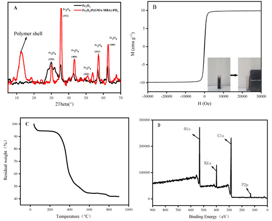 The X-ray powder diffraction (XRD) pattern of Fe3O4 and Fe3O4/P(GMA-MBA)-PO4 was shown in Figure 3A. The XRD pattern of Fe3O4/P(GMA-MBA)-PO4 showed many characteristic peaks of Fe3O4. Moreover, a peak of dispersion at a 2θ of about 12.5° representing amorphous P(GMA-MBA) was also seen in addition to the characteristic peaks of Fe3O4. The VSM pattern of Fe3O4/P (GMA-MBA)-PO4 is shown in Figure 3B. As shown in Figure 3B, the hysteresis loop passed through the origin with a coercivity force of zero, confirming the magnetic polymer microsphere adsorbent was superparamagnetic with a specific saturation magnetization of about 10.0 emu g−1. Thus, Fe3O4/P (GMA-MBA)-PO4 could be quickly separated and recovered from the aqueous solution by applying an external magnetic field within 20 s (Figure 3B inset). The thermal stability of the material was tested, and the results are shown in Figure 3C. From Figure 3C, the lost weight of the sample was mainly caused by the volatilization of the small molecule including water, solvent and monomers remaining on the surface of Fe3O4/P (GMA-MBA)-PO4 within 50–293 °C. However, when the temperature was above 293 °C, the mass of the magnetic adsorbent dropped sharply, which might have been due to the oxidative degradation of the polymer chain. Thus, according to Figure 3C, the prepared magnetic adsorbent had a high thermal stability. As shown in Figure 3D, the elemental composition of Fe3O4/P (GMA-MBA)-PO4 was also analyzed by XPS, and the magnetic adsorbent contained C, N, O and P. Combined with the results of infrared spectroscopy analysis, it is clear that the phosphonic acid group was successfully introduced to the surface of the magnetic sphere. Based on these results, the phosphonic acid functionalized core–shell magnetic sorbent Fe3O4/P(GMA-MBA)-PO4 was successfully prepared.