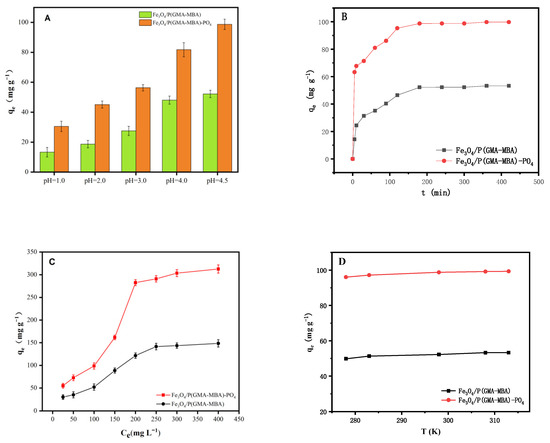 In general, the adsorption capacity of uranium is often significantly affected by pH, due to which the speciation of uranium and the surface charge of the adsorbent are affected to a large extent. Hence, the uranium adsorption capacity on Fe3O4/P (GMA-MBA) and Fe3O4/P (GMA-MBA)-PO4 was investigated with an initial pH ranging from 1.0 to 4.5, and the experimental results are shown in Figure 4A. From Figure 4A, the uranium adsorption capacity of the two magnetic adsorbents increased with the value of pH. In aqueous solutions of pH 4.5, the adsorption capacity of Fe3O4/P (GMA-MBA) and Fe3O4/P (GMA-MBA)-PO4 could reach up to 52.21 and 98.73 mg g−1, respectively. From Figure 4A, the uranium adsorption capacity of Fe3O4/P (GMA-MBA)-PO4 was much higher than that of Fe3O4/P (GMA-MBA). This result confirms that the prepared magnetic polymer microsphere adsorbent had the ability to efficiently separate the enriched uranyl ions in the aqueous solution, which was mainly due to the complexation of phosphoric acid functional groups on the surface of the adsorbent with uranyl ions.
