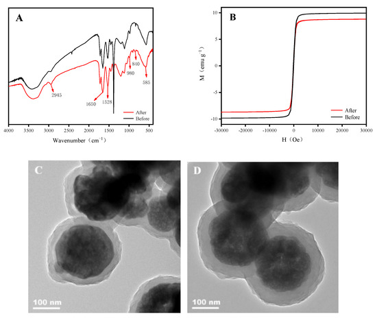 Fe3O4/P(GMA-MBA)-PO4 was soaked in a HNO3 medium with pH 4.5 for 24 h before and after: (A) Infrared spectra; (B) VSM spectrum; (C) TEM images taken before immersion; (D) TEM images after immersion.