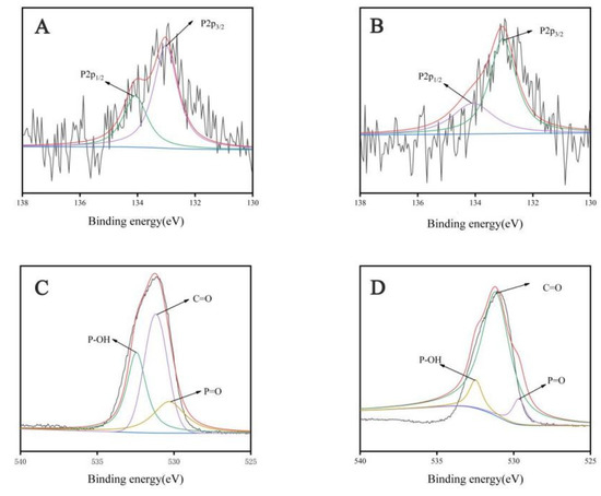 To study the interaction between magnetic adsorbent and uranium ions, XPS analysis of Fe3O4/P (GMA-MBA)-PO4 before and after uranium adsorption is shown in Figure 6A–D. As shown in Figure 6A, the two peaks located at 133.9 eV and 133.0 eV were the characteristic peaks of P 2p1/2 and P 2p3/2. Compared with Figure 6A, the binding energy strength and position of Fe3O4/P (GMA-MBA)-PO4 of P 2p1/2 changed significantly (Figure 6B), indicating a new complexation between uranyl with P. As shown in Figure 6C, the O 1s spectra could be decomposed into three peaks, and the characteristic peaks at 530.3 eV, 531.2 eV and 532.5 eV belonged to P=O, C=O, and P-OH. After adsorption of Fe3O4/P (GMA-MBA)-PO4 for uranium, the position of the binding energy and strength of O 1s of P=O and P-OH bond changed significantly, while the position of O 1s of C=O bond remained almost unchanged (Figure 6D). Thus, it could be concluded that the adsorption process mainly depended on the interaction between the phosphonic acid group with uranium.