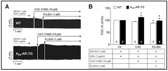 The yet unknown agonistic or antagonistic action of FLUDA towards the human A2A-AR was investigated in electrically stimulated atrial preparations of wild-type mice (WT) and hA2A-AR TG (Figure 2). As shown in Figure 2B, the FOC of WT was not changed after adding 10 µM of the A2A-AR agonist CGS 21680 (positive inotropic effect) to the organ bath. An anti-inotropic effect towards the human A2A-AR was observed after the subsequent adding of 1 µM FLUDA. The FOC was decreased by 15.0 ± 2.4% in the A2A-AR TG atria. Hence, these results revealed an antagonistic effect of FLUDA towards a stimulated A2A-AR.