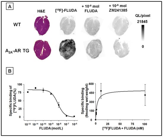 Representative in vitro autoradiographic images of the binding pattern of [18F]FLUDA mouse heart slices. (A) Hematoxylin/eosin staining (H & E), total binding of [18F]FLUDA, homologous (FLUDA), and non-homologous (ZM 241385) displacement of [18F]FLUDA; (B) representative homologous competition curve of [18F]FLUDA and the saturation curve transformed from competition curve from A2A-AR TG hearts. KD and Bmax were calculated from the homologous competition of [18F]FLUDA with FLUDA by the Cheng-Prusoff equation.