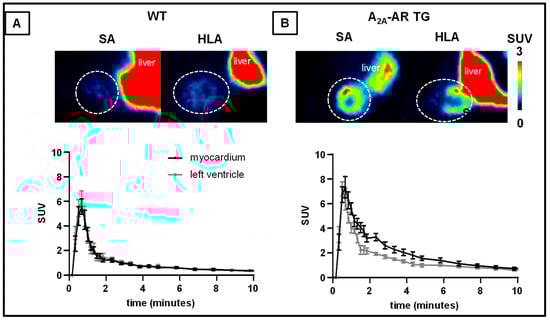 In vivo evaluation of the [18F]FLUDA biodistribution in the abdominal heart region by PET imaging. Images show the cardiac planes averaged from 1 to 10 min p.i. in the short axis (SA) and horizontal long axis (HLA) of averaged time frame between three and ten minutes after administration of [18F]FLUDA in (A) WT and (B) A2A-AR TG. The heart region is marked with a dotted circle. Mice were pre-treated with vehicle 10 min prior to radiotracer application. Lookup-table decodes for the mean activity concentration given in standardised uptake values (SUV).