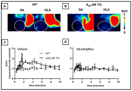 [18F]FLUDA time-activity curves (TACs) in the myocardium and the left ventricle (blood compartment). Values are represented as mean standardised uptake values (SUV ± S.E.M.) in the initial 10 min after radiotracer administration in (A) WT and (B) A2A-AR TG (n =). (C) TACs of the myocardium normalised to the blood compartment, and (D) to the muscle (SUVr ± S.E.M.); n = 6–8.