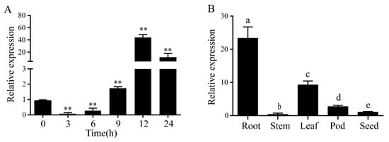 Previous studies have shown that LecRlk genes are involved in many plants’ response to abiotic stress, such as Arabidopsis thaliana [], Oryza sativa [] and Glycine soja []. To explore whether the GmLecRlk gene responds to salt stress in soybean, expression patterns were identified using qRT-PCR. The results showed that the mRNA abundance of GmLecRlk decreased at first and then increased and reached the peak at 12 h, which was about 40 times that of the control (Figure 1A). Further analysis of its tissue specificity showed that it was expressed in the root, stem, leaf, pod, and seed, and the highest expression level was in the roots (Figure 1B).