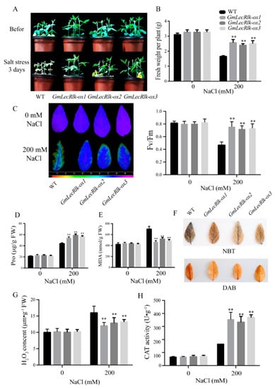 GmLecRlk improves salt tolerance in soybean. (A) Phenotypic analysis of GmLecRlk-ox and WT soybean under 200 mM NaCl; (B) fresh weight in GmLecRlk-ox and WT soybean with 0 or 200 mM NaCl; (C) Fv/Fm rate in GmLecRlk-ox and WT soybean with 0 or 200 mM NaCl. (D,E,G) Pro, MDA, and H2O2 content in GmLecRlk-ox and WT soybean with 0 or 200 mM NaCl. (F) GmLecRlk-ox and WT soybean leaves were stained with NBT and DAB under 200 mM NaCl for 3 days. (H) CAT activity in GmLecRlk-ox and WT soybean with 0 or 200 mM NaCl. **, GmLecRlk-ox soybean showed a significant difference from the WT (p < 0.01). Error bars, s.e.m.