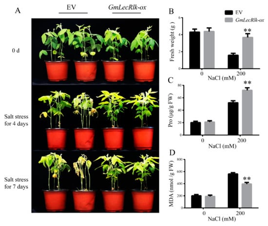 Phenotype identification of GmLecRlk under salt treatment in transgenic soybean hairy root compound plants. (A) Phenotypic analysis of GmLecRlk-ox and EV soybean hairy root compound plants grown under 0 or 200 mM NaCl; (B) fresh weight of GmLecRlk-ox and EV soybean hairy root compound plants with 0 or 200 mM NaCl after 7 days; (C,D) pro and MDA content in GmLecRlk-ox and EV soybean hairy root compound plants with 0 or 200 mM NaCl after 4 days. **, GmLecRlk-ox soybean hairy root compound plants showed a significant difference from EV (p < 0.01). Error bars, s.e.m.