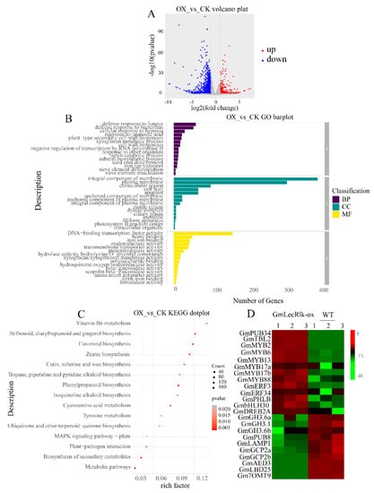 Transcriptomic analysis of GmLecRlk-ox and WT soybean. (A) Number of genes showing differential expression in GmLecRlk-ox and WT; (B) GO terms that were statistically enriched in differentially expressed genes in GmLecRlk-ox and WT; (C) KEGG enrichment analysis of differentially expressed genes in GmLecRlk-ox and WT plants; (D) The heat map of differential expression in GmLecRlk-ox and WT soybean. The numerical values for the green-to-red gradient bar represent the log2-fold change relative to the control sample.