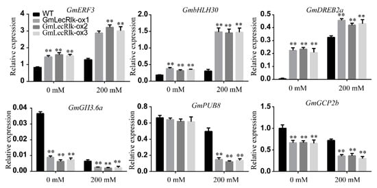 The transcriptional levels of GmERF3, GmbHLH30, GmDREB2a, GmGH3.6a, GmPUB8, and GmGCP2 in GmLecRlk-ox and WT soybean under 0 or 200 mM NaCl for 12 h. **, GmLecRlk-ox soybean showed a significant difference from the WT (p < 0.01). Error bars, s.e.m.