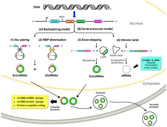 Although it was proposed that circRNAs are derived from precursor messenger (m)RNAs (pre-mRNAs) by back-splicing, the mechanism of circRNA biogenesis still remains elusive. circRNAs are generally generated by joining an upstream 3′ splice site to a downstream 5′ splice site to form a covalently closed loop []. Based on the original sequences, circRNAs can mainly be classified in three categories: exonic circular (ecirc)RNAs [,,], circular intronic (ci)RNAs [], and exon–intron circular (EIci)RNAs []. The majority (over 80%) of circRNAs mainly reside in the cytoplasm, while ciRNAs and EIciRNAs are mainly found in nuclei [,,]. Briefly, the formation of circRNAs can be classified into two popular models (Figure 1), the direct back-splicing model and the lariat precursor model.