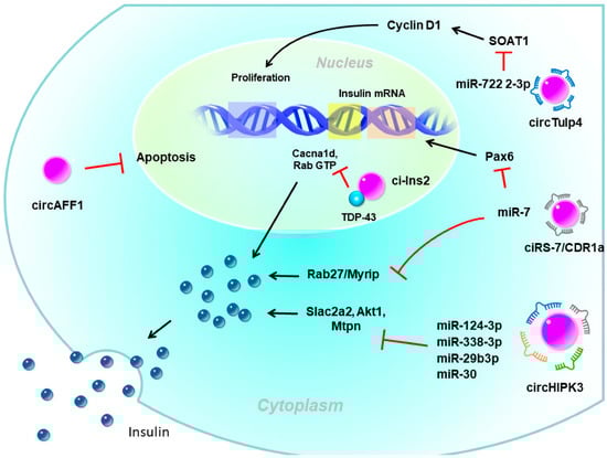 circRNAs have been proposed to be involved in the regulation of insulin secretion. The most well-known circRNAs with such functions were ciRS-7/CDR1a and circHIPK3. CDR1as, which originates from the antisense transcript of the cerebellar degeneration-related protein 1 gene, was the first circRNA studied in pancreatic β-cells [,]. Since it contains more than 70 binding sites for miR-7, it is also named ciRS-7 (circRNA sponge for miR-7) [,]. Studies showed that miR-7 is one of the most common miRNAs expressed by β-cells and is a negative regulator of glucose-stimulated insulin secretion (GSIS) in β-cells []. Interestingly, while the overexpression of miR-7 in transgenic mouse β-cells causes diabetes due to impaired insulin secretion [], overexpression of ciRS-7 leads to increased insulin secretion by islet cells by upregulating miR-7 target gene expressions, such as Myrip (myosin VIIA and Rab-interacting protein) []. ciRS-7 also enhances insulin transcription by regulating Pax6 (paired box 6) expression after sponging for miR-7 [].