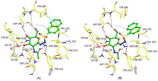 The most potent hOGA inhibitors were the naphthyl analogs, 5e (2-naphthyl) and 5f (1-naphthyl), with these ligands close to equipotent (Ki-s ~ 30 nM). The predicted binding of these inhibitors from the QM/MM optimizations are shown in Figure 3A,B, respectively. Both ligands are able to exploit favorable interactions with the Val254 sidechain and have the potential for NH–π contacts from the backbone NH of the flexible loop residue Val255, all of which could be the source of their observed superior potencies. The 2-naphthyl substituent of 5e is also aligned with the Tyr286 ring in a T-shaped configuration for π–π stacking interactions with a ring centroid–centroid distance of 5.1 Å. This can be considered consistent with geometric preferences of protein–ligand T-shaped π–π interactions from Protein Data Bank analysis, with T-shaped binding conformations also found to be the most predominant [25]. In the case of 5f, a 180° flip of the 1-naphthalene ring around the S–C(Ar) bond would lead to alternate π–π interactions with Phe223.