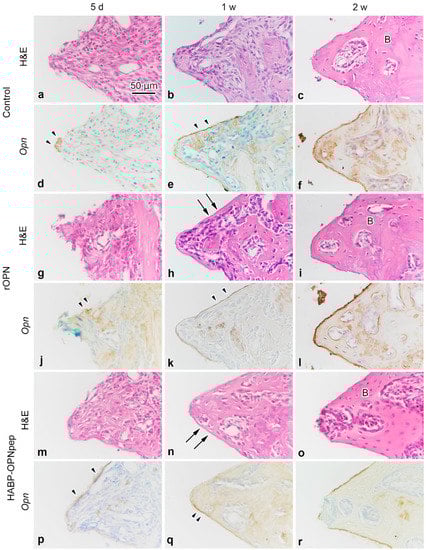 H&E-staining and OPN-immunoreactivity in the tissues surrounding the implants in the WT mice. (a,g,m) H&E-staining in the tissues surrounding the implants at day 5 after implant placement in the control, rOPN, and HABP-OPNpep groups. The infiltration of inflammatory cells and spindle-shaped or flattened cells is observed at the bone-implant interface. (d,j,p) There is a weak OPN positive immunoreaction at the bottom parts of threads and the cement lines of the pre-existing bone (arrowheads). (b,c,h,i,n,o) The formation of direct osteogenesis is clearly observed at week 1 (arrows) and week 2. (e,f,k,l,q,r) OPN-immunoreactivity gradually becomes intense (arrowheads) and elongates along the implant surface at week 2. B, bone. Scale bar = 50 μm.