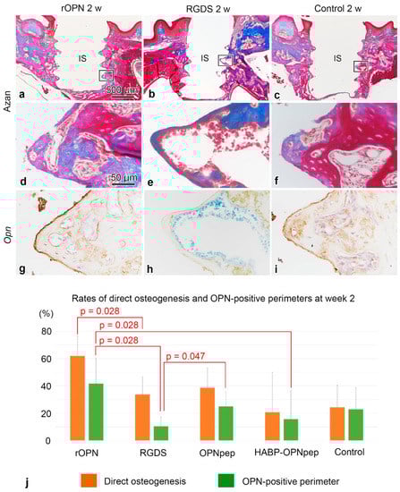 Azan-staining, OPN-immunoreactivity, and the rates of direct osteogenesis or OPN-positive perimeters in the WT mice. (a–f) Azan-staining in the tissues surrounding the implants at 2 weeks after implant placement in the rOPN, RGDS, and control groups. Partially, indirect osteogenesis progresses from the pre-existing bone in addition to the direct osteogenesis to achieve osseointegration at week 2. (d–f) are higher magnifications of the boxed areas in (a–c), respectively. (g–i) The OPN-immunoreactive lines coincide with the places where the direct osteogenesis occurs, although some areas lack the OPN reaction. (j) Quantification of the rates of direct osteogenesis and OPN-positive perimeters in rOPN (n = 5), RGDS (n = 5), OPNpep (n = 5), HABP-OPNpep (n = 5), and control (n = 3) groups. The RGDS and HABP-OPNpep groups without following normal distribution were compared by Kruskal–Wallis test followed by the Bonferroni test for multiple comparisons for more than three groups or Mann–Whitney U test for two groups. In the rOPN group, the OPN-positive perimeter around the implant surface significantly increases compared with that in the RGDS and HABP-OPNpep groups at week 2 and shows the highest rate compared with other groups. The OPN-positive perimeter in the OPNpep group is higher than that in the RGDS group. Statistical analysis used a two-tailed Student’s t-test or Mann–Whitney U test. As to the percentage of the vertical axis, the numerator is direct osteogenesis or OPN-positive perimeter around implant surface and the denominator is the perimeter of external surface of implant body. The rates are the mean + SD. IS, implant space. Scale bars = (a–c) 500, (d–i) 50 μm.