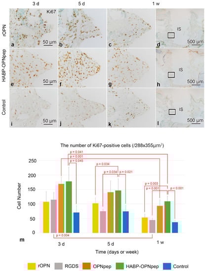 Proliferative activities gradually increased and then decreased during day 3 to week 1 (Figure 4a–l). The proliferative activity in the HABP-OPNpep group was significantly higher than that in the control group from day 3 to week 1 or those in rOPN and RGDS groups from day 5 to week 1 (Figure 4m). In contrast, the rOPN group, where the increased direct osteogenesis occurred, represented no significant differences compared with other groups.