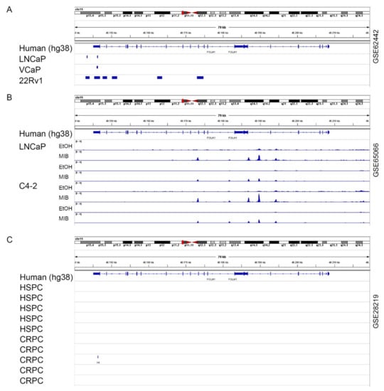 For AR ChIP-Seq analysis, the AR binding sites were extracted from the publicly available GEO dataset (GSE62442, GSE65066, GSE28219) and the data were visualized with the Integrative Genomics Viewer [38,61,62].
