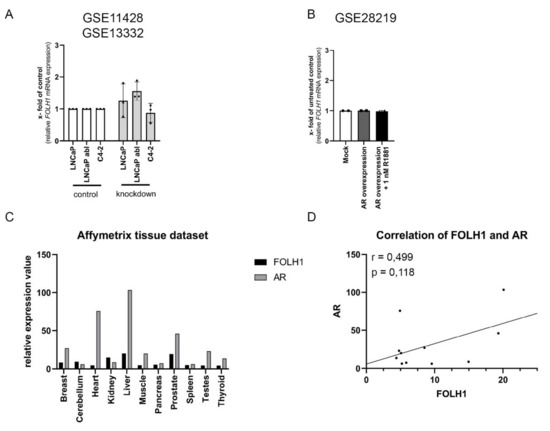 To assess if the expression of the AR is mandatory for FOLH1 mRNA expression, AR knockdown and overexpression were investigated. To this end, the datasets GSE11428 and GSE13332 were analyzed for changes in FOLH1 mRNA levels. These datasets reveal no change in FOLH1 mRNA levels after AR knockdown (Figure 4A). Analysis of the dataset GSE15091 also indicated no change in FOLH1 mRNA levels after overexpression of the AR in PC3 (Figure 4B). As knockdown and overexpression did not change FOLH1 mRNA levels, AR and FOLH1 mRNA levels were investigated in different tissue using the Affymetrix tissue dataset published on the publicly available database Project Betastasis (https://www.betastasis.com/tissues/affymetrix_tissue_dataset/, accessed on 24 October 2021). No correlation could be shown between AR and FOLH1 mRNA expression (Figure 4C,D).