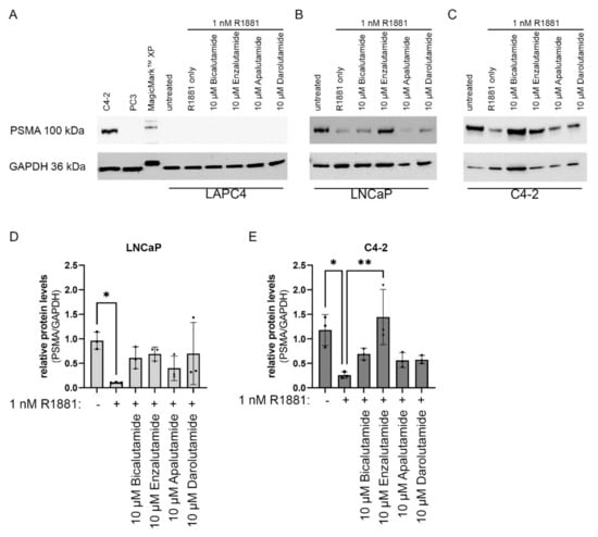 Impact of AR activity on PSMA protein levels: (A–C) Representative western blots of PSMA protein and GAPDH protein in the cell lines LAPC4 (A), PC3 (A), LNCaP (B), and C4-2 (C) after 1 nM R1881 and 10 µM bicalutamide, 10 µM enzalutamide, 10 µM apalutamide, or 10 µM darolutamide treatment. (D,E) Densiometric analysis of PSMA western blot analysis normalized to GAPDH after treatment with 1 nM R1881 and 10 µM bicalutamide, 10 µM enzalutamide, 10 µM apalutamide, or 10 µM darolutamide in the cell lines LNCaP (D) and C4-2 (E). Values are expressed as mean ± SD. All differences highlighted by asterisks were statistically significant (* p ≤ 0.05; ** p ≤ 0.01).