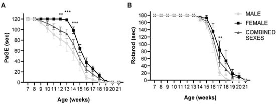 PaGE and rotarod test of untreated male, female and combined sexes: (A) PaGE test showing grip endurance of untreated SOD1(G93A) animals. There was a significant difference between male and female untreated groups at week 12 (p = 0.0038), week 13 (p = 0.0003) and week 14 (p = 0.0006), where the female animals displayed significantly better performance compared to the male mice (n = 10 male, 10 female); (B) Rotarod test showing motor coordination of untreated SOD1(G93A) animals. A significant difference between male and female mice was observed, with the female untreated mice showing significantly better performance at week 17 (p = 0.0025) compared to male animals. Results were analyzed by two-way ANOVA followed by the Bonferroni multiple comparisons test. ** p < 0.005; *** p < 0.0005. Data in all graphs are expressed as mean ± SEM.