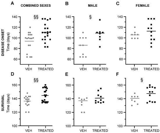 Disease onset and survival of combined sexes, male and female SOD1(G93A) mice in TREATED and VEH group: (A) The graph shows the disease onset of combined sex mice in the TREATED and VEH group. A significant delay in disease onset was observed in the TREATED animals compared to the VEH mice (p = 0.0055; n = 18 VEH, 20 TREATED); (B) The male mice in the TREATED group showed a statistically significant delay of disease onset compared with the VEH, (p = 0.0107; n = 10 VEH, 8 TREATED); (C) In the female animals, a trend was observed in the delay of disease onset of animals treated with the drugs, but was without statistical significance (p = 0.3294; n = 8 VEH, 12 TREATED); (D) The graph shows the rate of survival of combined sexes in the TREATED group compared to the VEH. The treated mice showed a significant improvement in survival rate compared to the VEH (p =0.0074; n = 16 VEH, 22 TREATED); (E) Male animals in the TREATED group displayed no significance in survival rate (p = 0.0702; n = 8 VEH, 10 TREATED); (F) In the female mice, an improvement in the lifespan of treated animals was observed with respect to the VEH mice (p = 0.0497; n = 8 VEH, 12 TREATED). Statistical analysis was performed with Log-rank (Mantel–Cox) test. Data in all graphs are expressed as mean ± SEM. § p < 0.05; §§ p < 0.005.