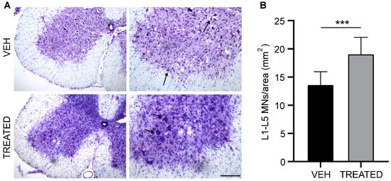 The MN count in the lumbar tract of the spinal cord (L1- L5): (A) Nissl staining on the L3 lumbar segment of the spinal cord at the end stage of the disease in VEH and TREATED groups. The arrow shows stained MN; (B) The graph shows the MN number/area in the L1-L5 tract of both the TREATED and VEH groups. In the TREATED group, there was a significant increase in MN survival compared to the VEH group (p = 0.0002; n = 10 VEH, 12 TREATED). Images on the left panel have a magnification of 10×, which images on the right panel have a magnification of 20× (scale bar = 100 μm). Data were analyzed by the Student t-test, expressed as mean ± SEM. *** p < 0.0005.