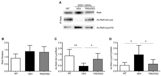 Immunoprecipitation and Western blot analyses were performed to assess the acetylation state of the RelA protein from the nuclear fraction of the lumbar spinal cord of WT, VEH and TREATED SOD1(G93A) male and female mice at end stages of the disease (Figure 5A). A trend in the increase of RelA nuclear level appeared in SOD1(G93A), VEH and TREATED groups, when compared to WT mice, though it did not reach a statistical significance (Figure 5B). Mice in the VEH group showed a significant reduction in the total acetylation of immunoprecipitated RelA compared to the WT (p = 0.0035). The treatment led to a significant increase in the total acetylation state of RelA (p = 0.0461) (Figure 5C). Immunoprecipitation was also performed to examine the site-specific acetylation of RelA at lysine 310. Results obtained showed a significant increase in the Lys 310 acetylation in the VEH group compared to WT (p = 0.0216), followed by a significant restoration of the acetylation state in animals that received the treatment (p = 0.0439) (Figure 5D). The animals were also specifically divided into male and female groups and the RelA acetylation was examined. Similar results were obtained, and no difference was observed between the acetylation state of male and female animals (see Supplementary Materials, Supplementary Data1, Figure S3). As reported in previous studies [], we demonstrated a general alteration of the acetylation state of RelA in SOD1(G93A) mice, and the combined drug treatment resulted in a restoration of the physiological RelA acetylation state evident in WT animals.