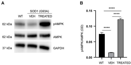 Analysis of phosphorylation state of AMPK in the experimental groups: (A) Representative Western blot showing the phosphorylation of AMPK; (B) Phosphorylation state of AMPK was significantly reduced in the VEH group compared with the WT (p < 0.0001). In the TREATED group, the phosphorylation state of AMPK was significantly increased versus the VEH (p < 0.0001) and the WT (p < 0.0001) groups (n = 6 WT, 10 VEH, 12 TREATED). Results were analyzed by one-way ANOVA, followed by Tukey’s multiple comparisons test. Data are shown as mean ± SEM. **** p < 0.0001. Full length blots are shown in Supplementary Materials in Supplementary Data 2 Figure S8.