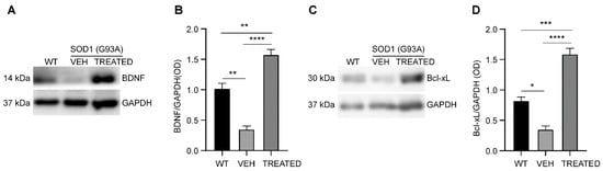 The level of brain-derived neurotrophic factors (BDNF) and Bcl-xL protein was examined in the cytoplasmic protein fraction of the lumbar spinal cord of WT, VEH and TREATED SOD1(G93A) mice at the end stage of the disease (Figure 7A). It was observed that the neurotrophic factor BDNF was significantly reduced in the VEH group compared to the WT (p = 0.0019). The drug treatment resulted in a significant increase in the BDNF levels in the TREATED group with respect to the VEH (p < 0.0001) and the WT (p = 0.0049), (Figure 7B). Moreover, a reduction in the anti-apoptotic factor Bcl-xL protein, was observed in the VEH animals compared to the WT (p = 0.0176), while the combined drug treatment significantly improved the expression of Bcl-xL protein with respect to the VEH (p < 0.0001), and WT as well (p = 0.0001) (Figure 7C, D). Similar results were obtained both in male and female animals (see Supplementary Materials, Supplementary Data1, Figure S5).
